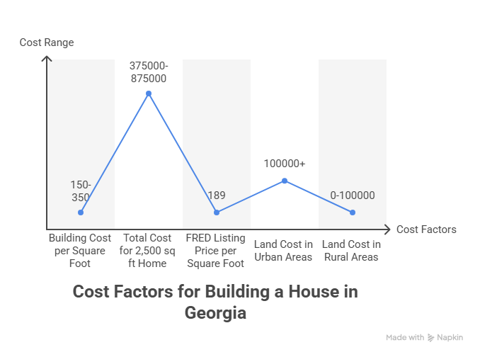 - Building a house in Georgia costs between $150 and $350 per square foot. This cost range is dependant on location, materials, and design complexity. As of recent, the median listing price per square foot in Georgia is $189.